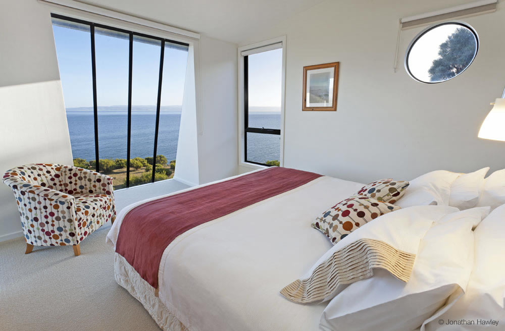 Exclusive waterfront hideaway perched above the scenic rocks of Great Oyster Bay, Freycinet. Ideal holiday retreat away from the maddening crowd. Two separate sleeping houses for your privacy whilst travelling with friends. "The Waterfront" and "The Boat House" . You will enjoy this property all to yourself because the two freestanding villas are only let to one group at a time. Couples will love The Waterfront villa, with each room showcasing that incredible view. Friends can stay in The Boat House, which holds a first-storey suite with its own deck and breathtaking outlook. It all comes together to create the ultimate package for a relaxing escape that you won’t want to leave. For the bird lovers - Abundant bird life all year round. Seasonal dolphin and whale sightings. BBQ facilities, 106cm TV/DVD Player in Waterfront & 80cm TV/DVD Player in Boat House, wood fire, reverse cycle airconditioning, electric heating and electric blankets. Luxury King/twin and Queen bed. Comfortable furnishings, fully equipped kitchen with gas cook top for the gourmet chef. A few minutes walk to the beach. Short drive to the golf course, Friendly Beaches, Freycinet National Park and Coles Bay village. Due to the floor plan of separate sleeping areas and the proximity of the unfenced cliff, Exclusive waterfront hideaway |